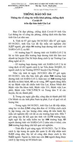 1. Tính từ 07 giờ ngày 04/10/2021 đến 07 giờ ngày 05/10/2021, tỉnh Gia Lai đã lấy mẫu xét nghiệm cho 3.227 người, ghi nhận 04 trường hợp dương tính mới với SARS-CoV-2; cụ thể: