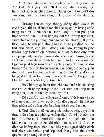 3. Ủy ban nhân dân tỉnh đã ban hành Công điện số 23/CĐ-UBND ngày 03/10/2021 về việc khẩn trương thực hiện một số biện pháp phòng, chống dịch Covid-19 đối với công dân ở các tỉnh vùng dịch tự phát về địa phương, cụ thể: