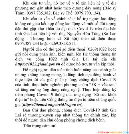 Khi cần tư vấn về chính sách hỗ trợ người lao động không có giao kết hợp đồng lao động và một số đối tượng đặc thù gặp khó khăn do đại dịch Covid-19 trên địa bàn tỉnh Gia Lai liên hệ với ông Nguyễn Hữu Tùng (Sở Lao động – Thương binh và Xã hội) theo số điện thoại 0905.387.234 hoặc 0269.3828.511.