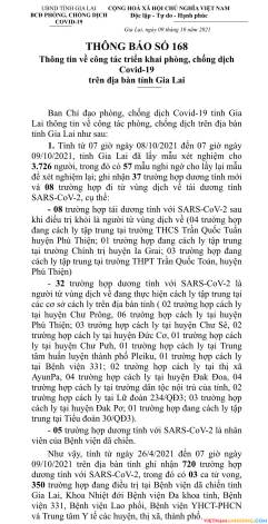 Thông báo 168: Gia Lai ghi nhận 37 trường hợp dương tính và 08 trường hợp đi từ vùng dịch về tái dương tính với Sars-CoV-2