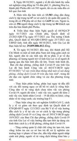 2. Ngày 08/10/2021, ngành y tế đã tiến hành lây mẫu xét nghiệm cộng đồng tại Tổ dân phố 11, phường Hoa Lư, thành phố Pleiku đối với 583 người, tất cả các mẫu đều có kết quả Âm tính