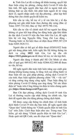 6. Tỉnh Gia Lai đã và đang rất khẩn trương, quyết liệt thực hiện công tác phòng, chống dịch Covid-19 trên địa bàn tỉnh. Đề nghị người dân hạn chế ra ngoài tỉnh nếu không thật sự cần thiết; khi phát hiện người đi từ vùng dịch về, người nhập cảnh vào địa phương… phải kịp thời thông báo cho chính quyền để kiểm tra.