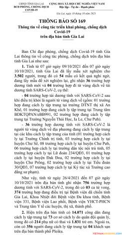 1. Tính từ 07 giờ ngày 09/10/2021 đến 07 giờ ngày 10/10/2021, tỉnh Gia Lai đã lấy mẫu xét nghiệm cho 3.502 người, trong đó có 54 mẫu có kết quả nghi ngờ, đang lấy mẫu để xét nghiệm lại, ghi nhận 36 trường hợp dương tính mới và 04 trường hợp đi từ vùng dịch về tái dương tính SARS-CoV-2, cụ thể: