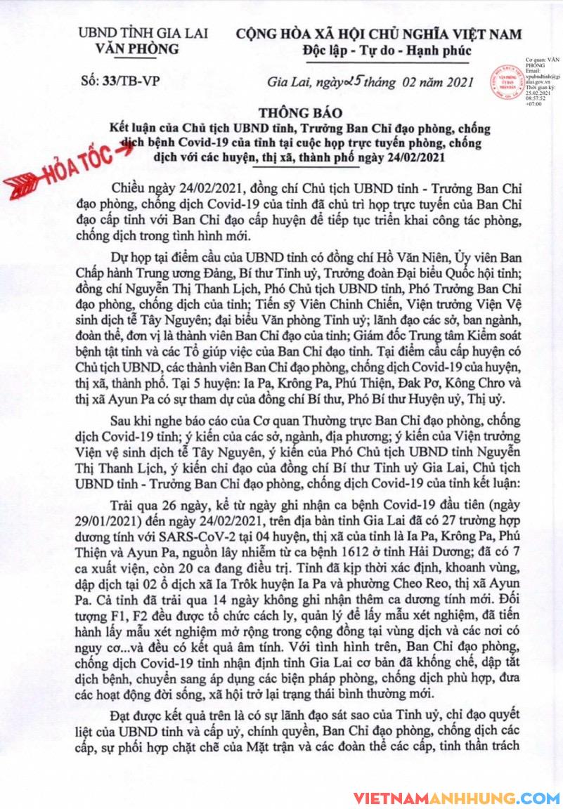 Văn phòng UBND tỉnh Gia Lai vừa có văn bản số 3190/VP-KGVX thông báo ý kiến của Trưởng ban Chỉ đạo phòng-chống...