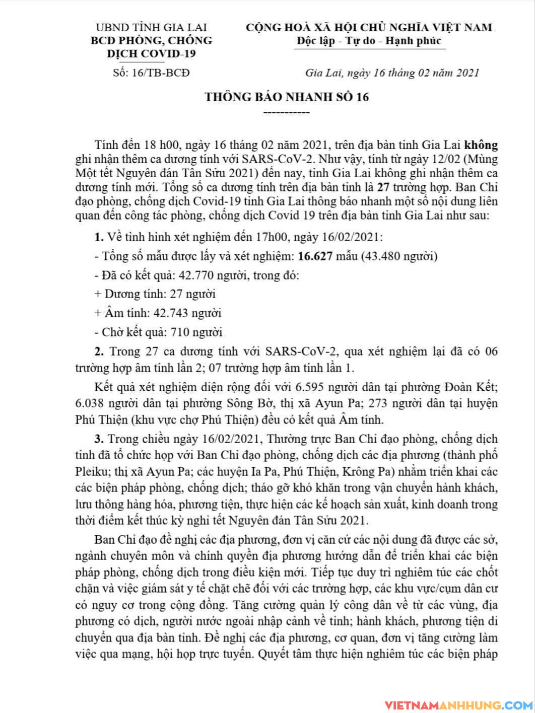 Thông báo nhanh số 16 của BCĐ Phòng, chống COVID-19 tỉnh Gia Lai.