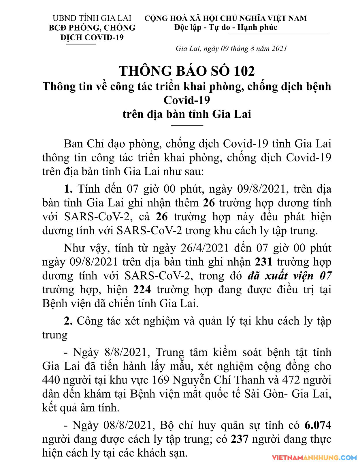 1. Tính đến 07 giờ 00 phút, ngày 09/8/2021, trên địa bàn tỉnh Gia Lai ghi nhận thêm 26 trường hợp dương tính với SARS-CoV-2, cả 26 trường hợp này đều phát hiện dương tính với SARS-CoV-2 trong khu cách ly tập trung.