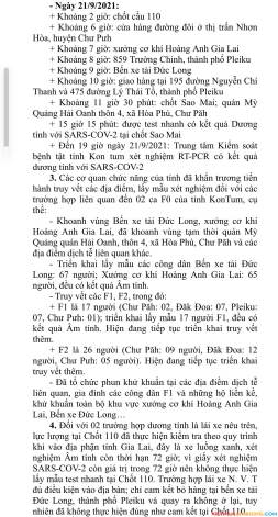 1. Tính từ 07 giờ 00 phút ngày 21/9/2021 đến 07 giờ00 phút ngày 22/9/2021, tỉnh Gia Lai đã lấy mẫu xét nghiệm cho 1.473 người, trong đó có 02 trường hợp tái dương tính với SARS-CoV-2 sau khi điều trị khỏi, xuất viện và thực hiện giám sát y tế tại nhà (huyện Phú Thiện: 01 trường hợp; huyện Chư Sê: 01 trường hợp).