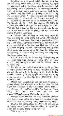 5. Nhằm hỗ trợ các doanh nghiệp, hợp tác xã, tổ hợp sản xuất quảng bá sản phẩm, kết nối giao thương trực tuyến với các doanh nghiệp, hệ thống siêu thị, cửa hàng kinh doanh nông sản, thực phẩm tại Hà Nội và thành phố Hồ Chí Minh và các địa phương khác trong cả nước, tránh bị đứt gãy chuỗi cung ứng, chuỗi giá trị nông sản do ảnh hưởng của đại dịch Covid-19; Trung tâm xúc tiến thương mại nông nghiệp có kế hoạch tổ chức Diễn đàn trực tuyến kết nối sản xuất, tiêu thụ nông sản và sản phẩm OCOP khu vực Tây Nguyên năm 2021- Diễn đàn nông sản 970 Phiên thứtư, thời gian diễn ra từ 8 giờ- 11 giờ 30 ngày 25/9/2021. Tỉnh Gia Lai sẽ tham dự hội nghị trực tuyến này dự kiến với 20 đại biểu tham gia tại phòng họp trực tuyến, Hội trường 2/9, thành phố Pleiku.