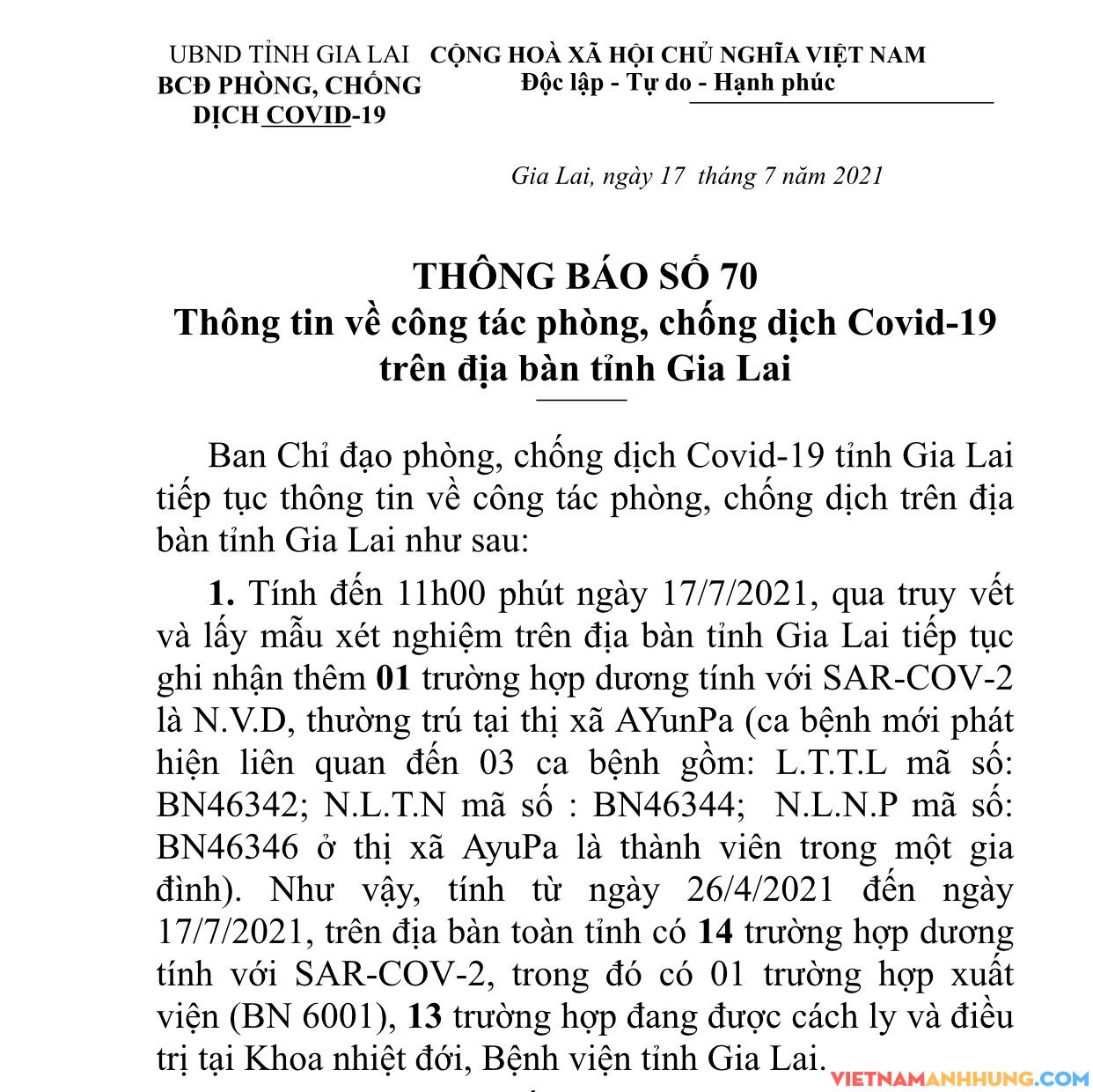 1. Tính đến 11h00 phút ngày 17/7/2021, qua truy vết và lấy mẫu xét nghiệm trên địa bàn tỉnh Gia Lai tiếp tục ghi nhận thêm 01 trường hợp dương tính với SAR-COV-2 là N.V.D, thường trú tại thị xã AYunPa (ca bệnh mới phát hiện liên quan đến 03 ca bệnh gồm: L.😭.L mã số: BN46342; N.L.T.N mã số : BN46344; N.L.N.P mã số: BN46346 ở thị xã AyuPa là thành viên trong một gia đình). Như vậy, tính từ ngày 26/4/2021 đến ngày 17/7/2021, trên địa bàn toàn tỉnh có 14 trường hợp dương tính với SAR-COV-2, trong đó có 01 trường hợp xuất viện (BN 6001), 13 trường hợp đang được cách ly và điều trị tại Khoa nhiệt đới, Bệnh viện tỉnh Gia Lai.