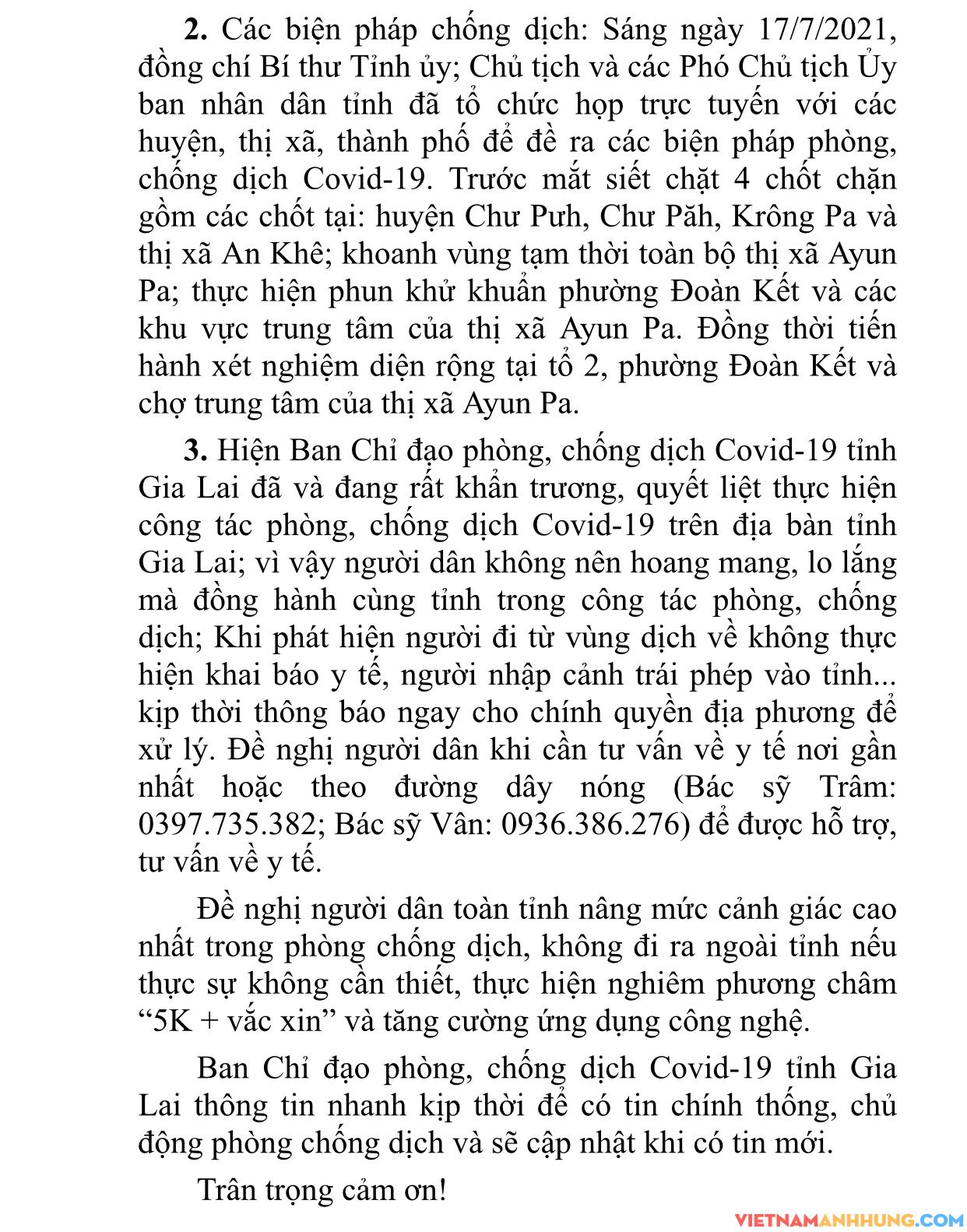 2. Các biện pháp chống dịch: Sáng ngày 17/7/2021, đồng chí Bí thư Tỉnh ủy; Chủ tịch và các Phó Chủ tịch Ủy ban nhân dân tỉnh đã tổ chức họp trực tuyến với các huyện, thị xã, thành phố để đề ra các biện pháp phòng, chống dịch Covid-19. Trước mắt siết chặt 4 chốt chặn gồm các chốt tại: huyện Chư Pưh, Chư Păh, Krông Pa và thị xã An Khê; khoanh vùng tạm thời toàn bộ thị xã Ayun Pa; thực hiện phun khử khuẩn phường Đoàn Kết và các khu vực trung tâm của thị xã Ayun Pa. Đồng thời tiến hành xét nghiệm diện rộng tại tổ 2, phường Đoàn Kết và chợ trung tâm của thị xã Ayun Pa.