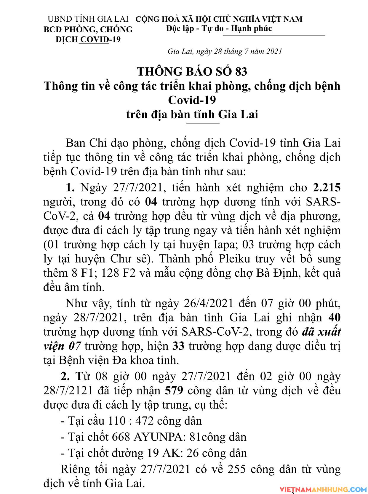 Thông báo số 83: Gia Lai phát hiện thêm 04 trường hợp dương tính Sars-CoV-2 trong khu cách ly