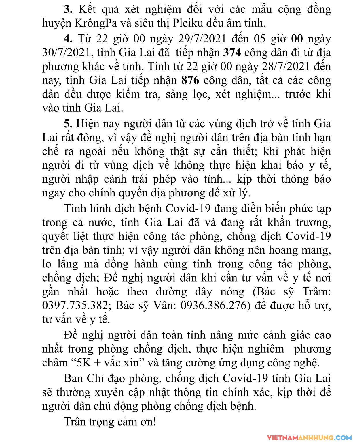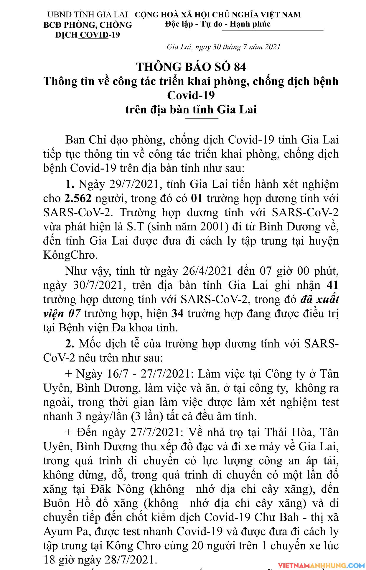 Ngày 29/7/2021, tỉnh Gia Lai tiến hành xét nghiệm cho 2.562 người, trong đó có 01 trường hợp dương tính với SARS-CoV-2. Trường hợp dương tính với SARS-CoV-2vừa phát hiện là S.T (sinh năm 2001) đi từ Bình Dương về, đến tỉnh Gia Lai được đưa đi cách ly tập trung tại huyện KôngChro.