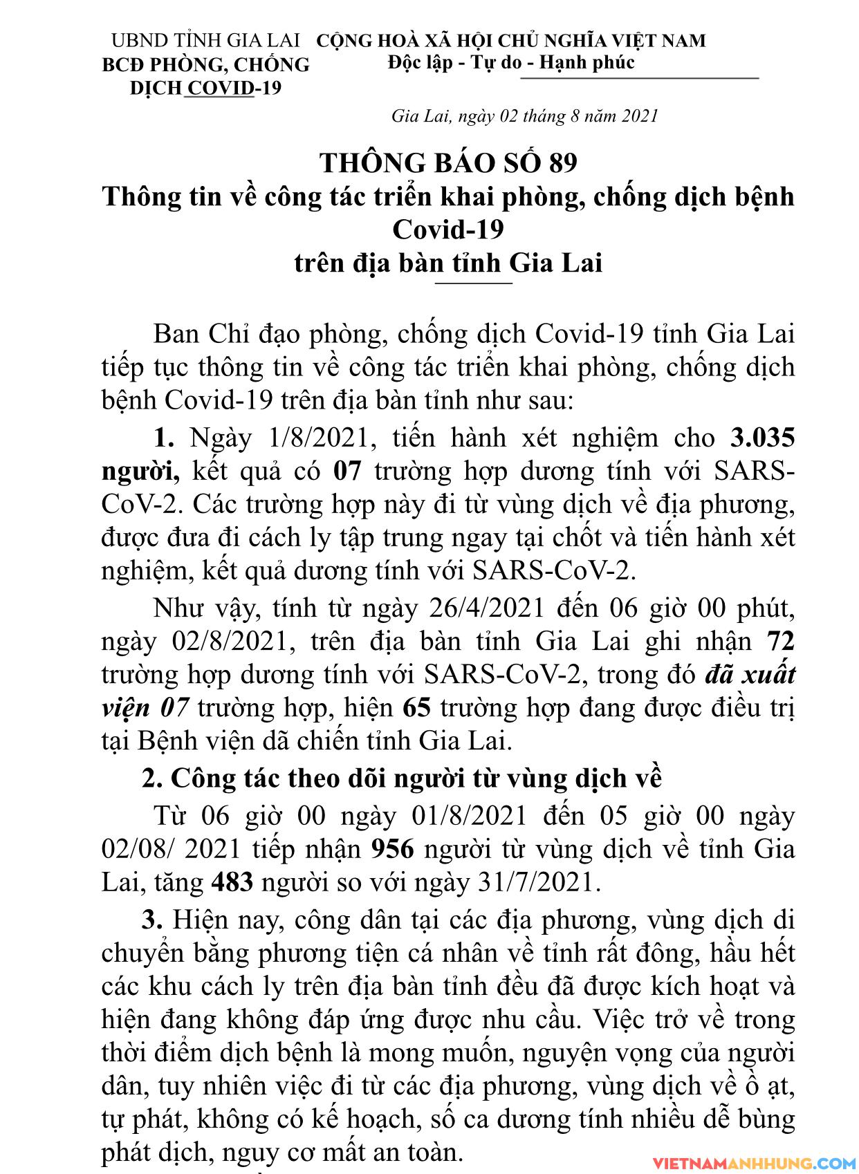 Như vậy, tính từ ngày 26/4/2021 đến 06 giờ 00 phút, ngày 02/8/2021, trên địa bàn tỉnh Gia Lai ghi nhận 72 trường hợp dương tính với SARS-CoV-2, trong đó đã xuất viện 07 trường hợp, hiện 65 trường hợp đang được điều trị tại Bệnh viện dã chiến tỉnh Gia Lai.
