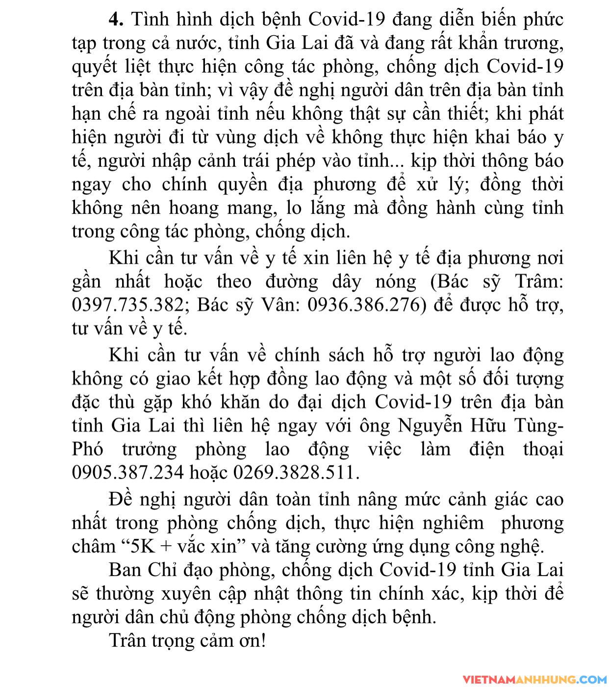 4. Tình hình dịch bệnh Covid-19 đang diễn biến phức tạp trong cả nước, tỉnh Gia Lai đã và đang rất khẩn trương, quyết liệt thực hiện công tác phòng, chống dịch Covid-19 trên địa bàn tỉnh; vì vậy đề nghị người dân trên địa bàn tỉnh hạn chế ra ngoài tỉnh nếu không thật sự cần thiết; khi phát hiện người đi từ vùng dịch về không thực hiện khai báo y tế, người nhập cảnh trái phép vào tỉnh… kịp thời thông báo ngay cho chính quyền địa phương để xử lý; đồng thời không nên hoang mang, lo lắng mà đồng hành cùng tỉnh trong công tác phòng, chống dịch.