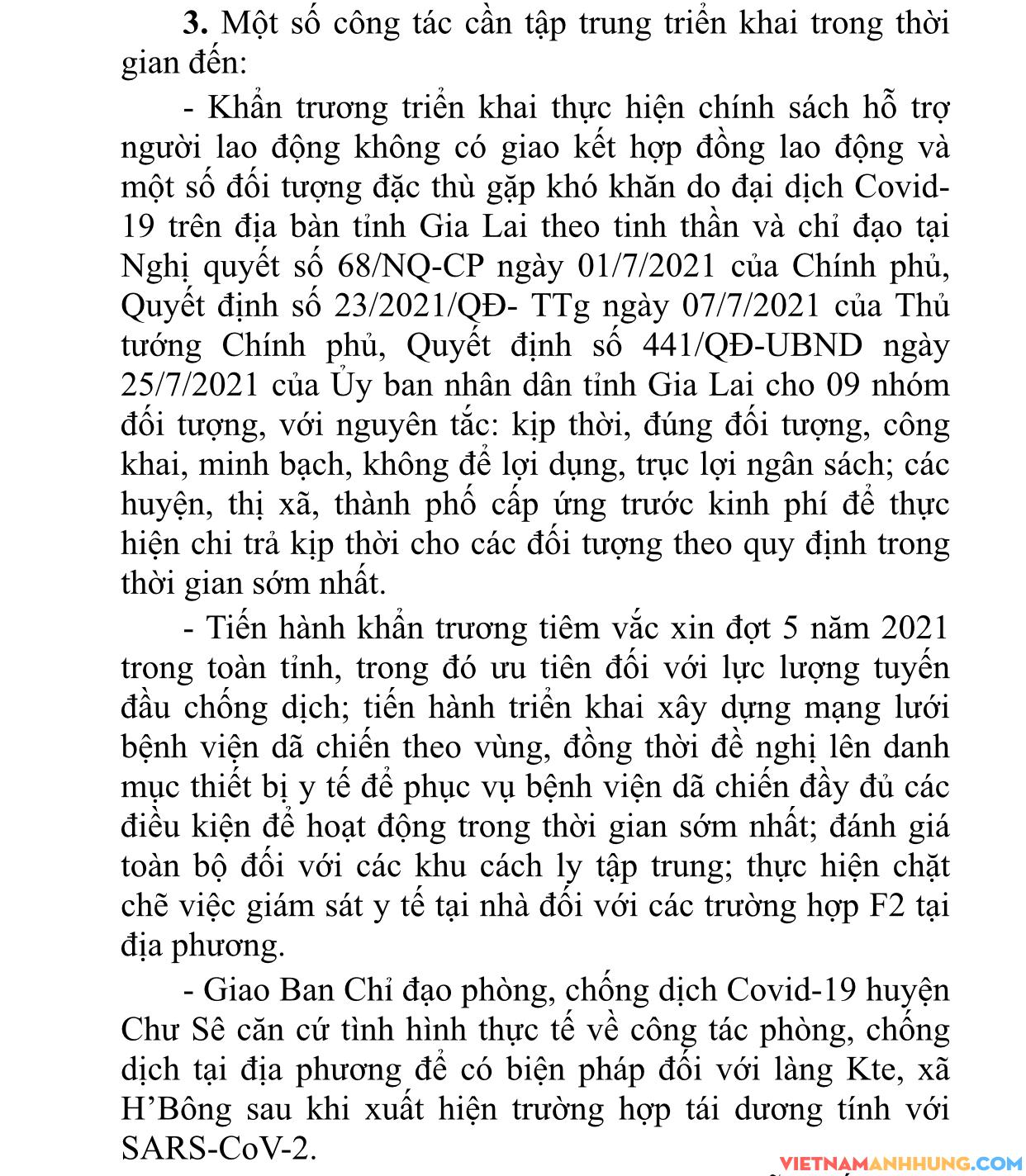 – Khẩn trương triển khai thực hiện chính sách hỗ trợ người lao động không có giao kết hợp đồng lao động và một số đối tượng đặc thù gặp khó khăn do đại dịch Covid-19 trên địa bàn tỉnh Gia Lai theo tinh thần và chỉ đạo tại Nghị quyết số 68/NQ-CP ngày 01/7/2021 của Chính phủ, Quyết định số 23/2021/QĐ- TTg ngày 07/7/2021 của Thủ tướng Chính phủ, Quyết định số 441/QĐ-UBND ngày 25/7/2021 của Ủy ban nhân dân tỉnh Gia Lai cho 09 nhóm đối tượng, với nguyên tắc: kịp thời, đúng đối tượng, công khai, minh bạch, không để lợi dụng, trục lợi ngân sách; các huyện, thị xã, thành phố cấp ứng trước kinh phí để thực hiện chi trả kịp thời cho các đối tượng theo quy định trong thời gian sớm nhất.