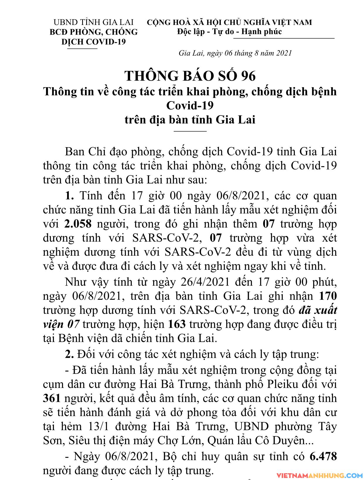 1. Tính đến 17 giờ 00 ngày 06/8/2021, các cơ quan chức năng tỉnh Gia Lai đã tiến hành lấy mẫu xét nghiệm đối với 2.058 người, trong đó ghi nhận thêm 07 trường hợp dương tính với SARS-CoV-2, 07 trường hợp vừa xét nghiệm dương tính với SARS-CoV-2 đều đi từ vùng dịch về và được đưa đi cách ly và xét nghiệm ngay khi về tỉnh.