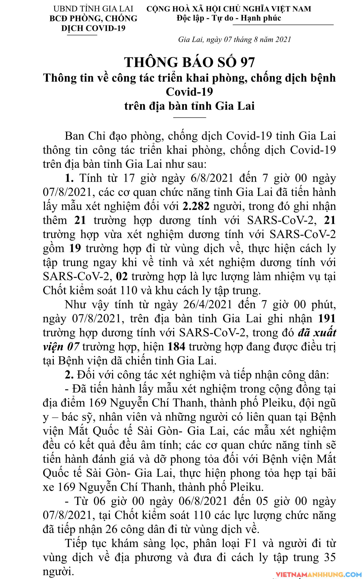 1. Tính từ 17 giờ ngày 6/8/2021 đến 7 giờ 00 ngày 07/8/2021, các cơ quan chức năng tỉnh Gia Lai đã tiến hành lấy mẫu xét nghiệm đối với 2.282 người, trong đó ghi nhận thêm 21 trường hợp dương tính với SARS-CoV-2, 21trường hợp vừa xét nghiệm dương tính với SARS-CoV-2 gồm 19 trường hợp đi từ vùng dịch về, thực hiện cách ly tập trung ngay khi về tỉnh và xét nghiệm dương tính với SARS-CoV-2, 02 trường hợp là lực lượng làm nhiệm vụ tại Chốt kiểm soát 110 và khu cách ly tập trung.