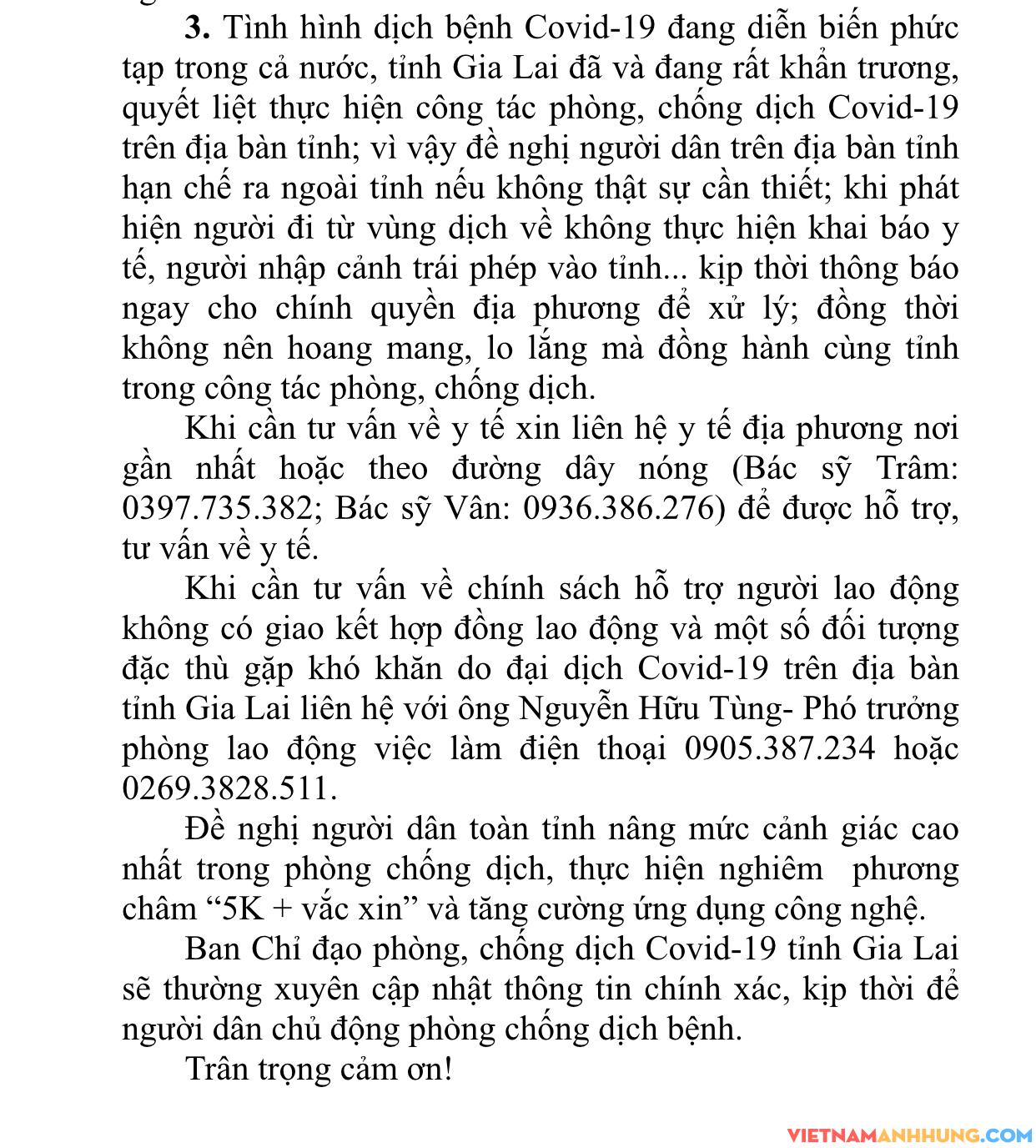 3. Tình hình dịch bệnh Covid-19 đang diễn biến phức tạp trong cả nước, tỉnh Gia Lai đã và đang rất khẩn trương, quyết liệt thực hiện công tác phòng, chống dịch Covid-19 trên địa bàn tỉnh; vì vậy đề nghị người dân trên địa bàn tỉnh hạn chế ra ngoài tỉnh nếu không thật sự cần thiết; khi phát hiện người đi từ vùng dịch về không thực hiện khai báo y tế, người nhập cảnh trái phép vào tỉnh… kịp thời thông báo ngay cho chính quyền địa phương để xử lý; đồng thời không nên hoang mang, lo lắng mà đồng hành cùng tỉnh trong công tác phòng, chống dịch.