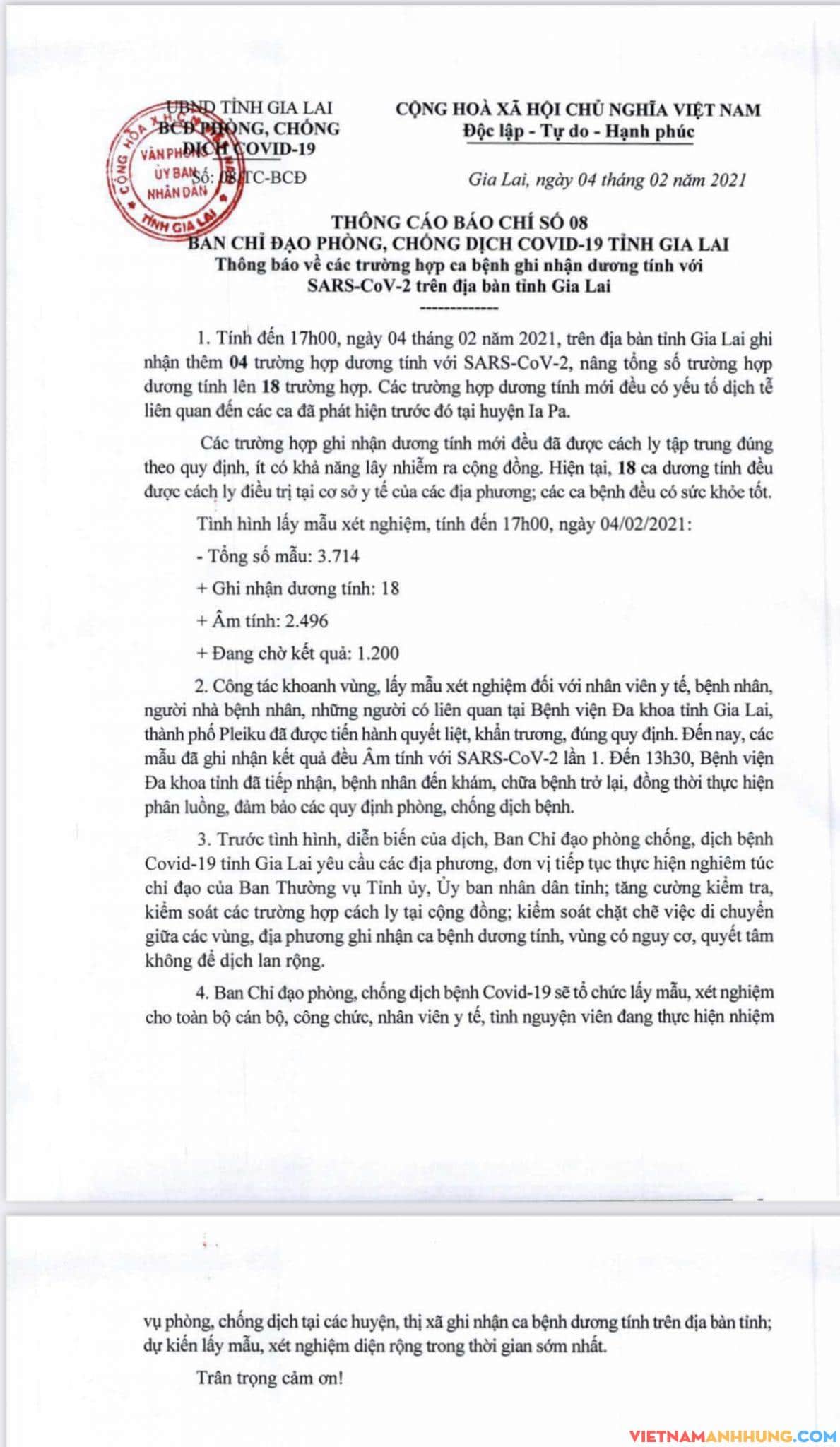 Cuối ngày 04/02/2021, Ban Chỉ đạo phòng, chống COVID-19 tỉnh Gia Lai ra công báo số 08 thông báo về 04 ca dương tính mới trên địa bàn tỉnh.