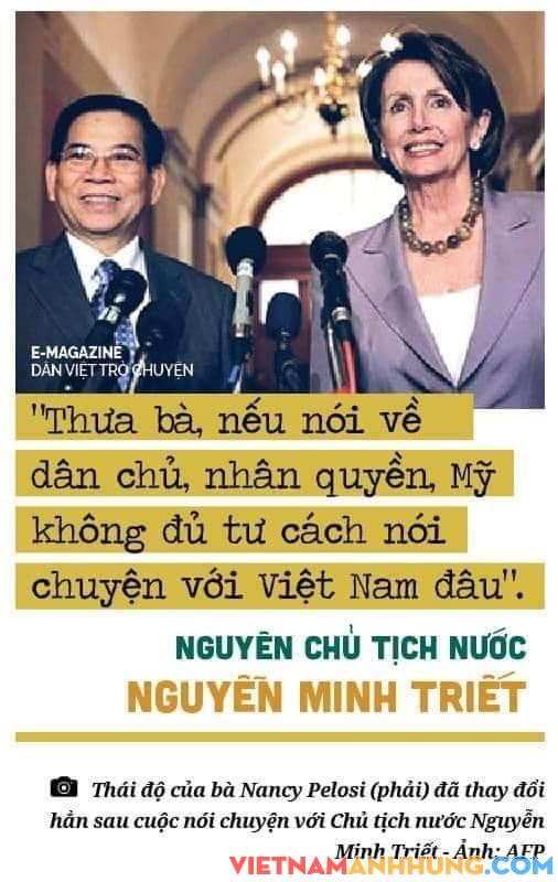 Cho bà Pelosi nói đã đời, Chủ tịch nước Nguyễn Minh Triết khi đó mới nhỏ nhẹ đáp lại: “Thưa bà, nếu nói về dân chủ, nhân quyền, Mỹ không đủ tư cách nói chuyện với Việt Nam đâu”.