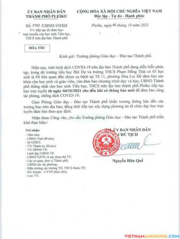 Ngày 01/10/2021, UBND thành phố Pleiku có văn bản hoả tốc số 3743/UBND-VHVX về việc thông báo cho học sinh Tiểu học, THCS trên địa bàn thành phố tiếp tục học trực tuyến cho đến khi có thông báo mới.