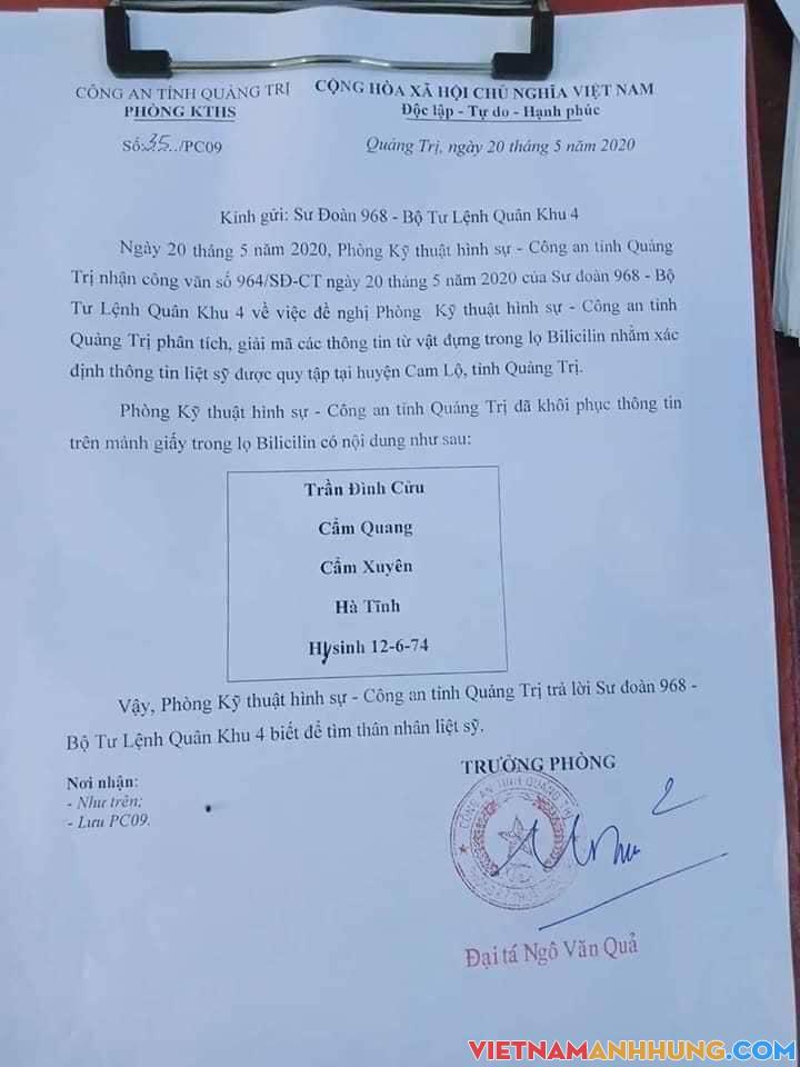 Cụ thể, mảnh giấy trong lọ thủy tinh có nội dung: Trần Đình Cửu, Cẩm Quang, Cẩm Xuyên, Hà Tĩnh, hy sinh 12/6/1974.