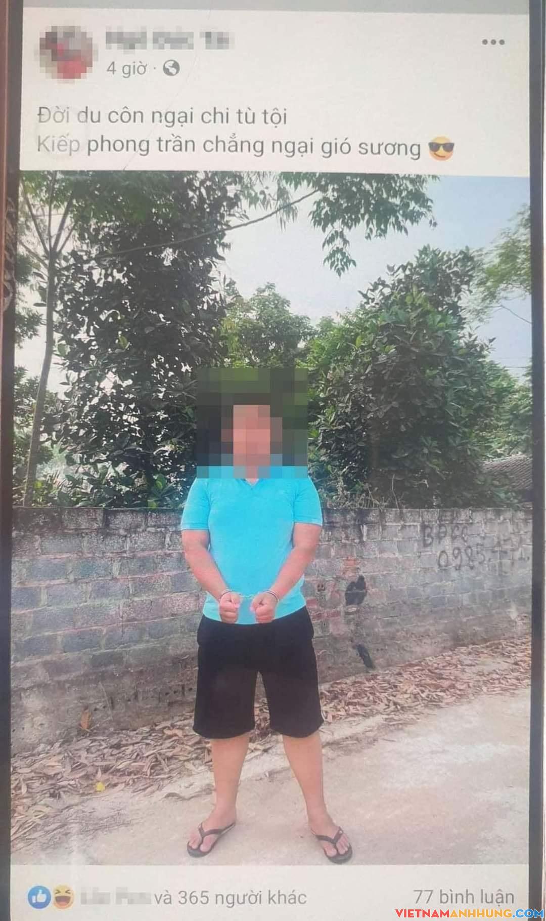 Cụ thể, qua nắm tình hình trên không gian mạng, Công an xã Thanh Vân phát hiện tài khoản Facebook có tên “N.Đ.T” đăng tải hình ảnh 1 nam thanh niên đứng trong tư thế 2 tay bị còng phía trước bởi chiếc còng số 8. Hình ảnh đăng kèm dòng trạng thái “Đời du côn ngại chi tù tội – Kiếp phong trần chẳng ngại gió sương”.