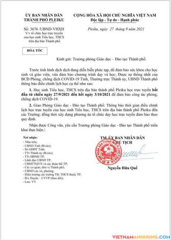 Ngày 27/9/2021, UBND thành phố Pleiku ban hành hoả tốc văn bản số 3676/UBND-VHVX về việc học trực tuyến đối với học sinh Tiểu học và THCS trên địa bàn thành phố Pleiku như sau: